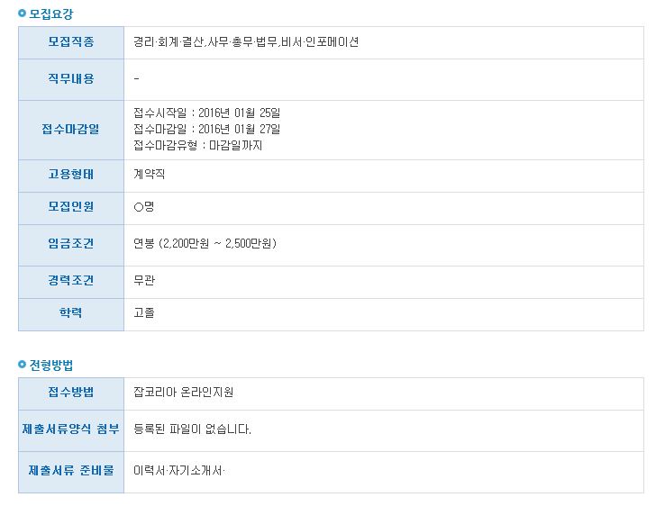 Ãâó : http://www.work.go.kr/empInfo/empInfoSrch/detail/retrivePriEmpDtlView.do?iorgGbcd=CJK&callPage=detail&wantedAuthNo=21299210&rtnUrl=/empInfo/empInfoSrch/list/dtlEmpSrchList.do?len=0&tot=0&relYn=N&totalEmpCount=0&jobsCount=0&lastIndex=1&siteClcd=all&academicGbnoEdu=noEdu&firstIndex=1&pageSize=10&recordCountPerPage=10&preferentialGbn=all&rowNo=0&softMatchingPossibleYn=N&benefitSrchAndOr=O&keyword=%EB%B9%84%EC%84%9C%EC%A7%81&charSet=EUC-KR&startPos=0&collectionName=tb_workinfo&softMatchingMinRate=+66&softMatchingMaxRate=100&certifiYn=N&preferentialYn=Y&preferential=all&&empTpGbcd=1&onlyTitleSrchYn=N&onlyContentSrchYn=N&serialversionuid=3990642507954558837&resultCnt=10&sortOrderBy=DESC&sortField=DATE&pageIndex=1&pageUnit=10