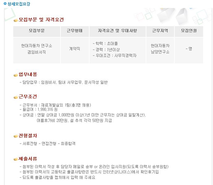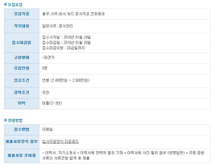 Ãâó : http://www.work.go.kr/empInfo/empInfoSrch/detail/retrivePriEmpDtlView.do?iorgGbcd=CSI&callPage=detail&wantedAuthNo=25977047&rtnUrl=/empInfo/empInfoSrch/list/dtlEmpSrchList.do?len=0&tot=0&relYn=N&totalEmpCount=0&jobsCount=0&lastIndex=1&siteClcd=all&academicGbnoEdu=noEdu&firstIndex=1&pageSize=10&recordCountPerPage=10&preferentialGbn=all&rowNo=0&softMatchingPossibleYn=N&benefitSrchAndOr=O&keyword=%EB%B9%84%EC%84%9C%EC%A7%81&charSet=EUC-KR&startPos=0&collectionName=tb_workinfo&softMatchingMinRate=+66&softMatchingMaxRate=100&certifiYn=N&preferentialYn=Y&preferential=all&&empTpGbcd=1&onlyTitleSrchYn=N&onlyContentSrchYn=N&serialversionuid=3990642507954558837&resultCnt=10&sortOrderBy=DESC&sortField=DATE&pageIndex=1&pageUnit=10