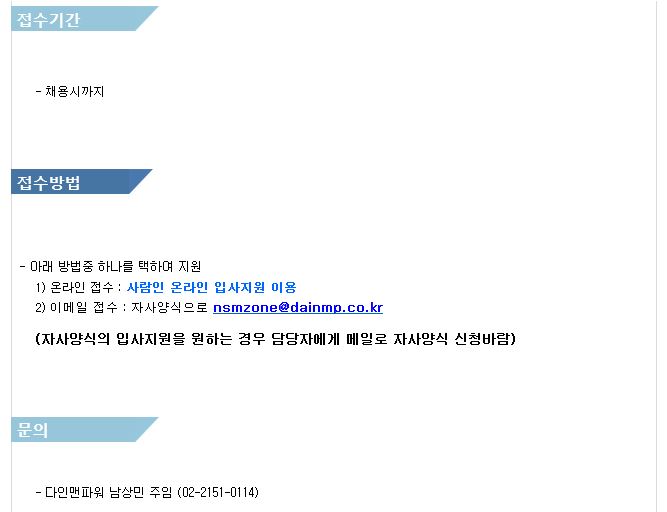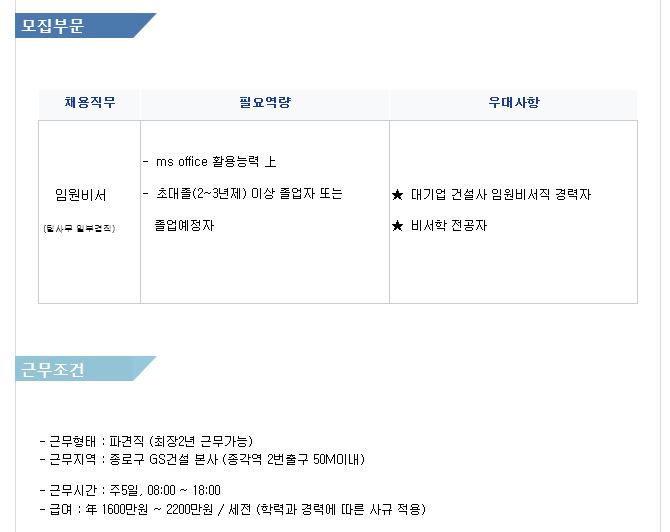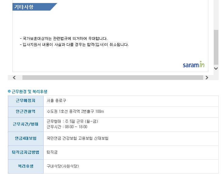 Ãâó : http://www.work.go.kr/empInfo/empInfoSrch/detail/retrivePriEmpDtlView.do?iorgGbcd=CSI&callPage=detail&wantedAuthNo=25776100&rtnUrl=/empInfo/empInfoSrch/list/dtlEmpSrchList.do?len=0&tot=0&relYn=N&totalEmpCount=0&jobsCount=0&lastIndex=1&siteClcd=all&academicGbnoEdu=noEdu&firstIndex=1&pageSize=10&recordCountPerPage=10&preferentialGbn=all&rowNo=0&softMatchingPossibleYn=N&benefitSrchAndOr=O&keyword=%EB%B9%84%EC%84%9C%EC%A7%81&charSet=EUC-KR&startPos=0&collectionName=tb_workinfo&softMatchingMinRate=66&softMatchingMaxRate=100&certifiYn=N&preferentialYn=Y&preferential=all&&empTpGbcd=1&onlyTitleSrchYn=N&onlyContentSrchYn=N&serialversionuid=3990642507954558837&resultCnt=10&sortOrderBy=DESC&sortField=DATE&pageIndex=6&pageUnit=10
