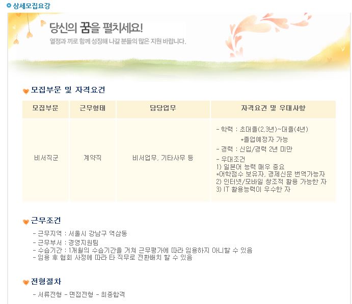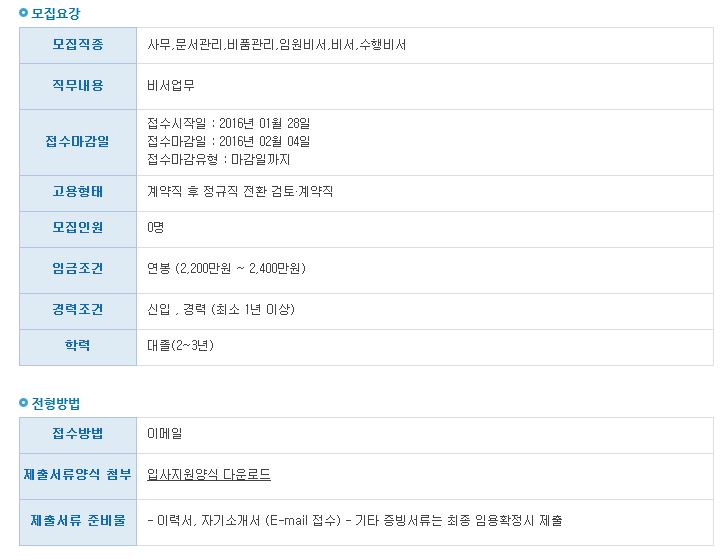Ãâó : http://www.work.go.kr/empInfo/empInfoSrch/detail/retrivePriEmpDtlView.do?iorgGbcd=CSI&callPage=detail&wantedAuthNo=26021009&rtnUrl=/empInfo/empInfoSrch/list/dtlEmpSrchList.do?len=0&tot=0&relYn=N&totalEmpCount=0&jobsCount=0&lastIndex=1&siteClcd=all&academicGbnoEdu=noEdu&firstIndex=1&pageSize=10&recordCountPerPage=10&preferentialGbn=all&rowNo=0&softMatchingPossibleYn=N&benefitSrchAndOr=O&keyword=%EB%B9%84%EC%84%9C%EC%A7%81&charSet=EUC-KR&startPos=0&collectionName=tb_workinfo&softMatchingMinRate=66&softMatchingMaxRate=100&certifiYn=N&preferentialYn=Y&preferential=all&&empTpGbcd=1&onlyTitleSrchYn=N&onlyContentSrchYn=N&serialversionuid=3990642507954558837&resultCnt=10&sortOrderBy=DESC&sortField=DATE&pageIndex=2&pageUnit=10