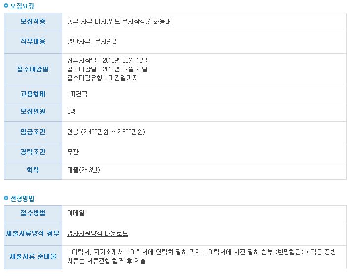 Ãâó : http://www.work.go.kr/empInfo/empInfoSrch/detail/retrivePriEmpDtlView.do?iorgGbcd=CSI&callPage=detail&wantedAuthNo=26134334&rtnUrl=/empInfo/empInfoSrch/list/dtlEmpSrchList.do?len=0&tot=0&relYn=N&totalEmpCount=0&jobsCount=0&lastIndex=1&siteClcd=all&academicGbnoEdu=noEdu&firstIndex=1&pageSize=10&recordCountPerPage=10&preferentialGbn=all&rowNo=0&softMatchingPossibleYn=N&benefitSrchAndOr=O&keyword=%EB%B9%84%EC%84%9C%EC%A7%81&charSet=EUC-KR&startPos=0&collectionName=tb_workinfo&softMatchingMinRate=66&softMatchingMaxRate=100&certifiYn=N&preferentialYn=Y&preferential=all&&empTpGbcd=1&onlyTitleSrchYn=N&onlyContentSrchYn=N&serialversionuid=3990642507954558837&resultCnt=10&sortOrderBy=DESC&sortField=DATE&pageIndex=2&pageUnit=10