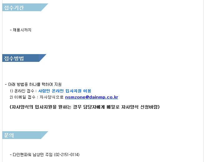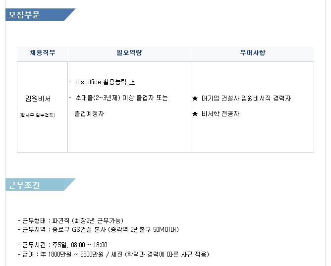 Ãâó : http://www.work.go.kr/empInfo/empInfoSrch/detail/retrivePriEmpDtlView.do?iorgGbcd=CSI&callPage=detail&wantedAuthNo=25776100&rtnUrl=/empInfo/empInfoSrch/list/dtlEmpSrchList.do?len=0&tot=0&relYn=N&totalEmpCount=0&jobsCount=0&lastIndex=1&siteClcd=all&academicGbnoEdu=noEdu&firstIndex=1&pageSize=10&recordCountPerPage=10&preferentialGbn=all&rowNo=0&softMatchingPossibleYn=N&benefitSrchAndOr=O&keyword=%EB%B9%84%EC%84%9C%EC%A7%81&charSet=EUC-KR&startPos=0&collectionName=tb_workinfo&softMatchingMinRate=66&softMatchingMaxRate=100&certifiYn=N&preferentialYn=Y&preferential=all&&empTpGbcd=1&onlyTitleSrchYn=N&onlyContentSrchYn=N&serialversionuid=3990642507954558837&resultCnt=10&sortOrderBy=DESC&sortField=DATE&pageIndex=7&pageUnit=10