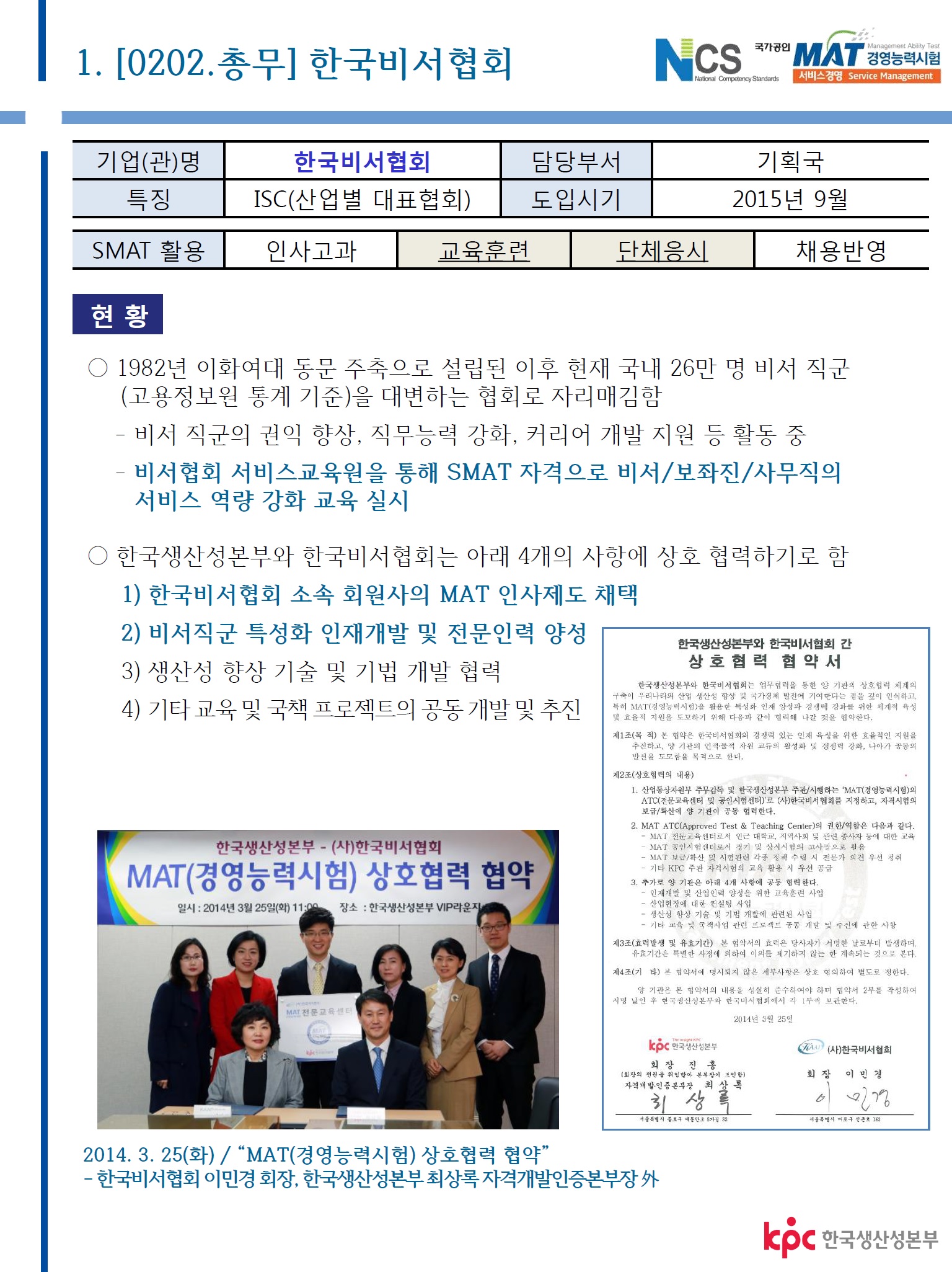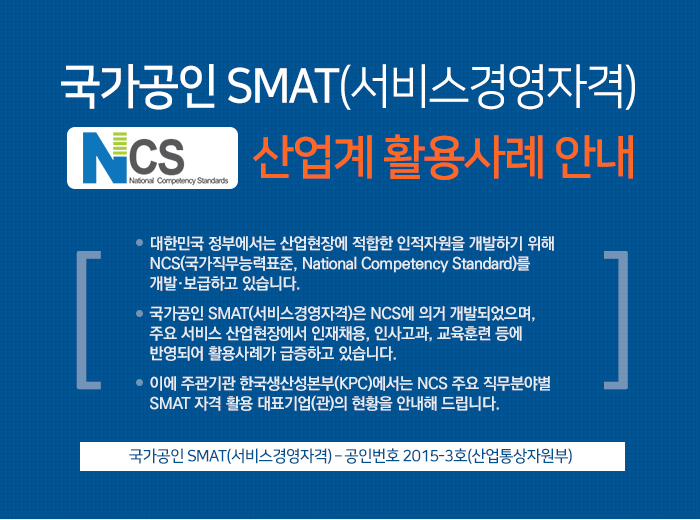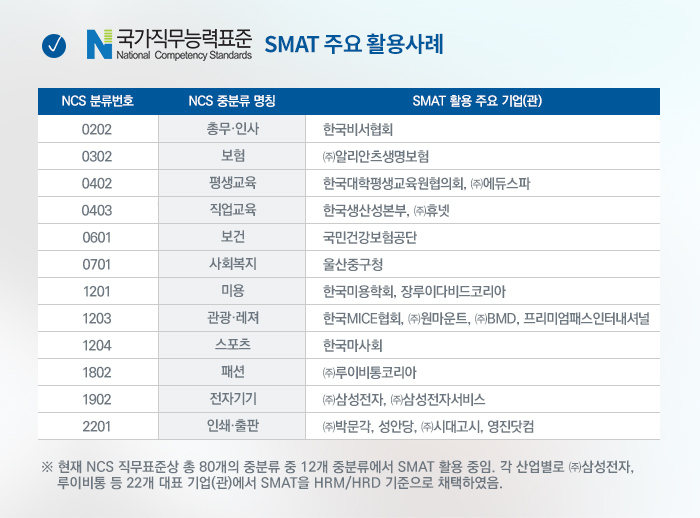 ¸¹Àº À¯¼öÀÇ ±â¾÷µé°ú ³ª¶õÈ÷ »ç´Ü¹ýÀÎ Çѱ¹ºñ¼Çùȸ°¡ NCS ±â¹Ý SMAT Ȱ¿ë»ç·Ê·Î °Å·ÐµÇ°íÀÖ½À´Ï´Ù.
