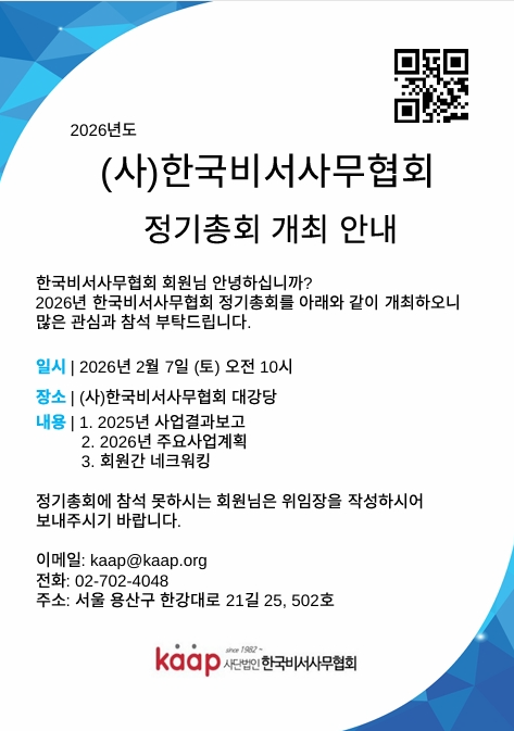 ¾È³çÇϼ¼¿ä? Çѱ¹ºñ¼»ç¹«Çùȸ Á¦26Â÷ Á¤±âÃÑȸ ¾È³»µå¸³´Ï´Ù. - ¾Æ ·¡ -- ÀϽà : 2026³â 2¿ù 7ÀÏ (Åä) ¿ÀÀü10½Ã- Àå¼Ò : (»ç)Çѱ¹ºñ¼»ç¹«Çùȸ ´ë°´ç- ³»¿ë : 1. 2025³â »ç¾÷°á°úº¸°íȸ 2. 2026³â ÁÖ¿ä»ç¾÷°èȹ 3. ȸ¿ø°£ ³×Å©¿öÅ·Á¤±âÃÑȸ¿¡ Âü¼®¿©ºÎ¸¦ ȸ½ÅÇÏ¿© ÁÖ½Ã¸é °¨»çÇϰڽÀ´Ï´Ù.ºÎµæÀÌ Âü¼®ÀÌ ¾î·Á¿ì½Å ȸ¿ø´ÔÀº ÷ºÎµÈ À§ÀÓÀåÀ» ÀÛ¼ºÇÏ¿© ³¯ÀÎ ÈÄemail (kaap@kaap.org) ¶Ç´Â ÆÑ½º (02-702-4049), ¿ìÆíÀ¸·Î ¹ß¼ÛÇÏ¿© Áֽʽÿä.Á¤±âÃÑȸ ȸ½ÅÇϱâ