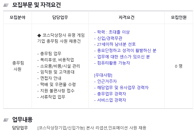 Ãâó: http://www.work.go.kr/empInfo/empInfoSrch/detail/retrivePriEmpDtlView.do?iorgGbcd=CSI&callPage=detail&wantedAuthNo=27482315&rtnUrl=/empInfo/empInfoSrch/list/dtlEmpSrchList.do?len=0&tot=0&relYn=N&totalEmpCount=0&jobsCount=0&mainSubYn=N&lastIndex=1&siteClcd=all&academicGbnoEdu=noEdu&firstIndex=1&pageSize=10&recordCountPerPage=10&preferentialGbn=all&rowNo=0&softMatchingPossibleYn=Y&benefitSrchAndOr=O&keyword=%EB%B9%84%EC%84%9C&charSet=EUC-KR&startPos=0&collectionName=tb_workinfo&softMatchingMinRate=66&softMatchingMaxRate=100&occupation=029100*ºñ¼*null|029101*Àü¹®ºñ¼*null|029102*ÀϹݺñ¼*null&certifiYn=N&preferentialYn=Y&preferential=all&termSearchGbn=all&&empTpGbcd=1&onlyTitleSrchYn=N&onlyContentSrchYn=N&serialversionuid=3990642507954558837&resultCnt=10&sortOrderBy=DESC&sortField=DATE&pageIndex=2&pageUnit=10