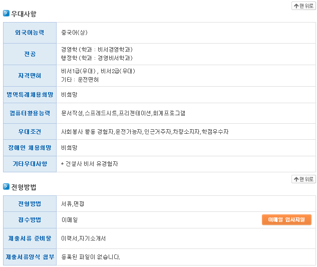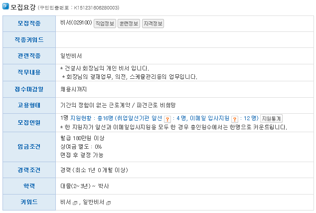 Ãâó: http://www.work.go.kr/empInfo/empInfoSrch/detail/empDetailAuthView.do?callPage=detail&wantedAuthNo=K151231606280003&rtnUrl=/empInfo/empInfoSrch/list/dtlEmpSrchList.do?len=0&tot=0&relYn=N&totalEmpCount=0&jobsCount=0&mainSubYn=N&lastIndex=1&siteClcd=all&academicGbnoEdu=noEdu&firstIndex=1&pageSize=10&recordCountPerPage=10&preferentialGbn=all&rowNo=0&softMatchingPossibleYn=Y&benefitSrchAndOr=O&keyword=%EB%B9%84%EC%84%9C&charSet=EUC-KR&startPos=0&collectionName=tb_workinfo&softMatchingMinRate=66&softMatchingMaxRate=100&occupation=029100*ºñ¼*null*null*null|029101*Àü¹®ºñ¼*null*null*null|029102*ÀϹݺñ¼*null*null*null&certifiYn=N&preferentialYn=Y&preferential=all&termSearchGbn=all&&empTpGbcd=1&onlyTitleSrchYn=N&onlyContentSrchYn=N&serialversionuid=3990642507954558837&resultCnt=10&sortOrderBy=DESC&sortField=DATE&pageIndex=2&pageUnit=10